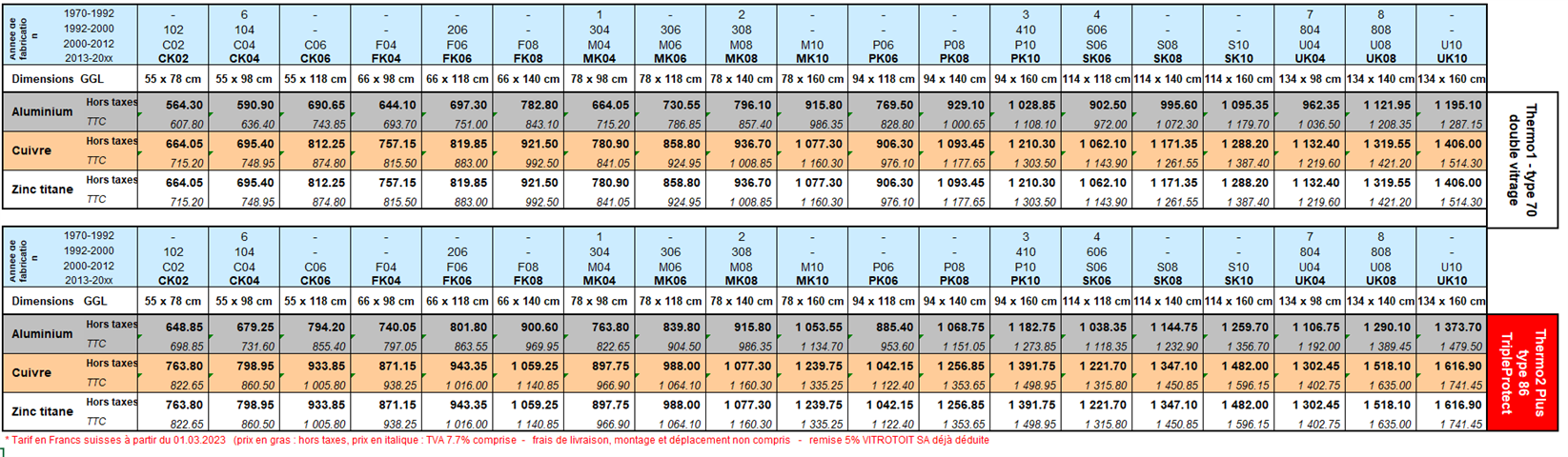 TARIF FENETRES DE TOIT VELUX GGL MANUELLES VALABLE DES LE 1ER MARS 2023 (POSE NON COMPRISE)